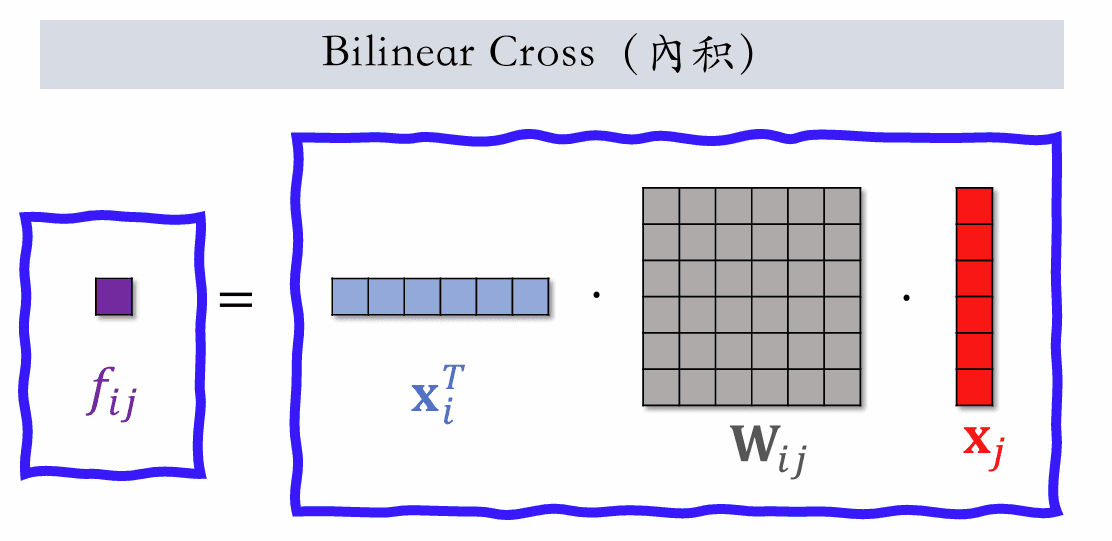 xiTx^T_ixjx_j 都是特征的 embedding 向量,fijf_{ij} 是一个向量,如果有 mm 个 field,他们之间两两哈达玛乘积,就会有 m2m^2 个向量。量太大,需要人工指定一部分向量做交叉,而不是所有向量都交叉。